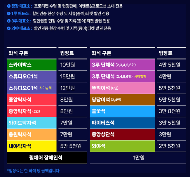 예매는 2시 부터 시작되며 좌석마다 입장료가 다르며 좌석배치도도 홈페이지에 나와있으니 배치도를 보고 예매하는 방법을 추천드립니다.