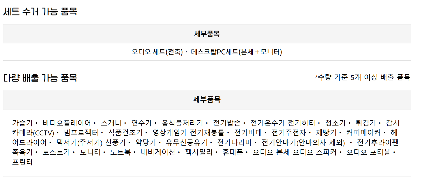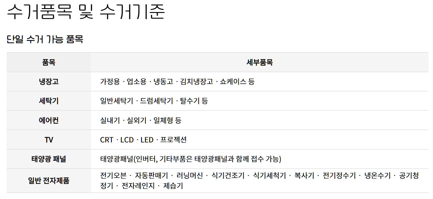 - 대형 가전제품 : 냉장고, 세탁기, 에어컨, TV, 김치냉장고, 업소용 냉동고 등은 단일 품목으로도 수거 가능합니다.