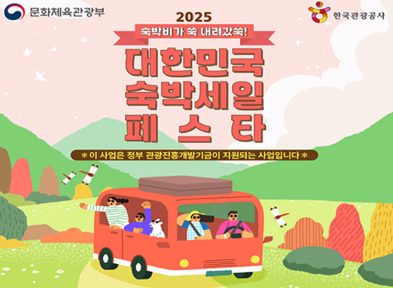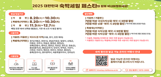 한국관광공사 공식 누리집과 참여 온라인여행사에서 숙박세일페스타 할인쿠폰을 빠르게 발급받아 올 가을과 겨울, 국내 숙박 할인 혜택을 꼭 누려보시길 바랍니다.